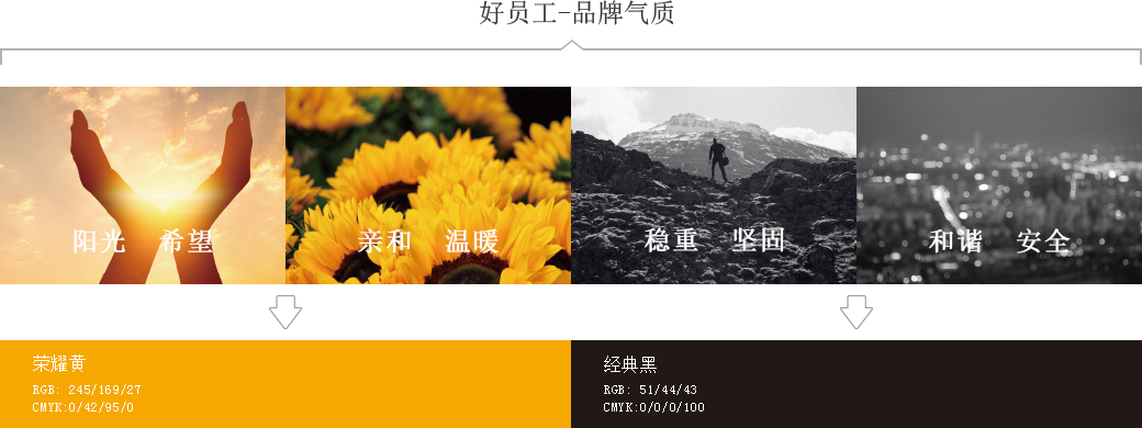 好員工黃黑搭配的經典德系色彩體系,從色彩感覺上強調品質,綜合體現出好員工的品牌氣質和品牌實力。